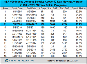 標準普爾500指數已連續198天收於其50日移動平均線之上,這是自1950年以來的第5長紀錄。如此平穩的上漲實在是極為罕見。$SPX