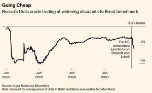 俄羅斯烏拉爾原油價格已暴跌至每桶36美元——這是兩年多以來的最低水平——就在針對俄羅斯最大石油公司的新一輪美國制裁即將生效的幾天前。 由於買家急劇撤回,擔心違反即將到來的次級制裁,與布倫特原油的折扣已膨脹至每桶超過23美元。 這對莫斯科已經緊張的戰時預算造成了毀滅性的打擊。