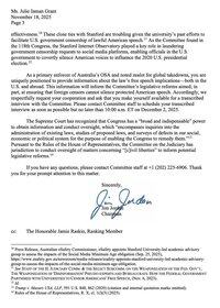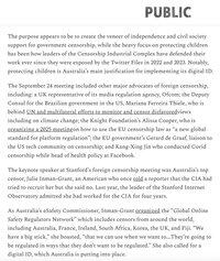 "委員會還了解到,你與美國的親審查實體勾結,以促進澳大利亞及其他國家的全球審查制度。根據委員會獲得的文件,你最近在2025年9月25日於斯坦福大學的一個非公開活動上發表了“主題演講”。
