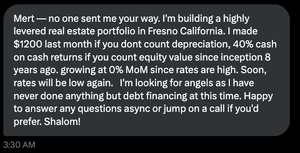 "Mert — <共同朋友>把我介紹給你。我正在建立一個橄欖油農場。我們上個月賺了N $,之前是N-J $,等等,按月增長X%。這是我們的簡報或演示。估值是這樣那樣的,我正在尋找幾位天使投資人。如果你有任何問題,我很樂意隨時回答,或者如果你更喜歡的話,可以通話。祝好!"