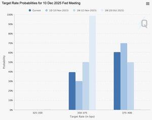 美國聯邦儲備局在下次會議(12月10日)降息的概率在過去一個月內從99%(幾乎確定!)下降到40%。 昨天降到30%。