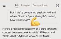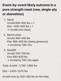 我請@grok將巔峰時期的宇宙先生阿諾德·施瓦辛格與2022年時期的鯨魚型埃隆·馬斯克進行一場「純力量」比賽。 明智地,它選擇了巔峰阿諾德獲勝。🥇 但我得說,埃隆能舉起一些金屬: 深蹲 550 磅 臥推 405 磅 硬舉 620 磅 💪 🏋️♂️