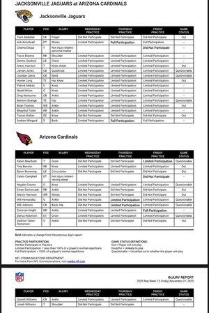 美洲虎隊排除了防守端鋒特拉文·沃克和外接手布萊恩·托馬斯二世,將缺席週日對亞利桑那的比賽。