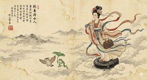一幅绘制在陈旧宣纸上的传统中国工笔水墨画。一位身着红色、米色和青色飘带的唐代仙女,头梳高髻佩戴牡丹花,站立在一个圆形的黑色扫地机器人上,在云雾中飞行。