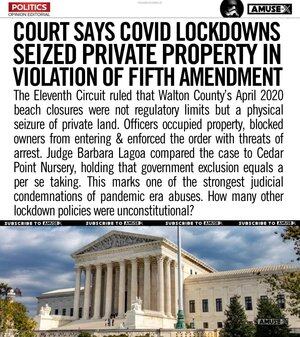 SCOTUS:一項重大的第十一巡迴法院裁決剛剛宣告佛羅里達州的 COVID 海灘關閉是一次實質性徵收。執法官阻止業主進入自己的土地並威脅逮捕。法官 Lagoa 說這違反了第五修正案。其他封鎖政策現在可能會受到挑戰。