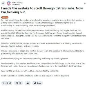 > 進入一個反變性者的子版塊,期待裡面只有被「迫使」變成變性人的人 > 意識到他們並不虛假,且都有長期的發文歷史支持他們的故事 > 隨之而來的是崩潰 不過,對於這位花時間這麼做的人表示讚賞。我希望他們都能這樣做。