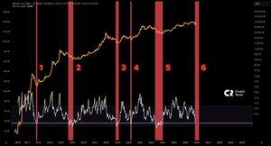 長期的比特幣的 RSI 指標達到這麼低 在歷史上只出現過六次 前五次全部都在築底階段