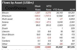 🚨突發消息:數位資產投資產品上週流出19.4億美元,這是連續第四週,也是自2018年以來第三大流出,總計達到49.2億美元。 比特幣流出12.7億美元,以太坊流出5.89億美元,索拉納流出1.56億美元,儘管美國現貨ETF流入強勁。XRP是唯一一個有流入的主要資產,流入金額為8930萬美元。