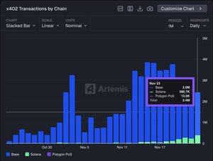 Base 仍然主導 x402,但 @solana 正在以 386k 的日交易量增長