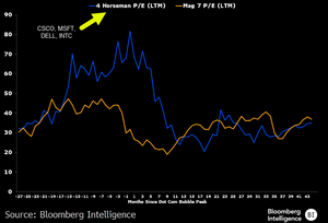 "自2022年熊市以來,Mag7的估值已穩定在40倍以下,因為利潤逐漸追上價格。相比之下,在1999年,四騎士的倍數從31.9倍飆升至80倍以上,然後泡沫破裂。"
