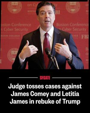 一名聯邦法官於週一駁回了對前FBI局長詹姆斯·科米和紐約州檢察長萊蒂提亞·詹姆斯的刑事案件,認為在總統唐納德·特朗普的要求下提出指控的檢察官是由司法部非法任命的。
