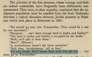 要理解今天在巴勒斯坦發生的事情,回想一下1891年兩位猶太復國主義定居者的對話,這段對話由摩西·斯米蘭斯基記錄。