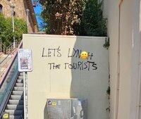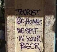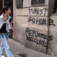 在巴塞隆納,越來越多的反旅遊塗鴉出現,Antifa 發起了一項名為: “遊客回家,歡迎難民” 🇪🇸