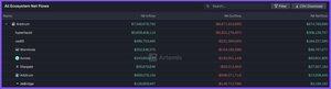 Arbitrum 在 1 個月的資金流入中領先,達到 +$675M,而 Hyperliquid 驅動了近一半的流入。 Hyperliquid