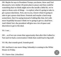 彭博社釋出的部分讀取內容,涉及上個月美國特使史蒂夫·維特科夫與俄羅斯總統弗拉基米爾·普京的首席外交政策顧問尤里·烏沙科夫之間的洩漏電話通話。在通話中,維特科夫試圖指導克里姆林宮如何更輕鬆地威脅特朗普總統,同時似乎也試圖擾亂特朗普與烏克蘭總統弗拉基米爾·澤連斯基當週的會議。