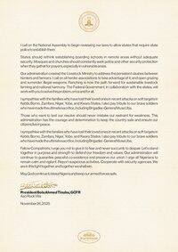 讓我在此時刻讚揚我們的安全機構,感謝他們共同努力,確保在凱比州釋放24名女學生和在夸拉州釋放38名朝聖者。我們將繼續努力,拯救尼日爾州天主教學校的剩餘學生和其他仍被扣押的尼日利亞人。