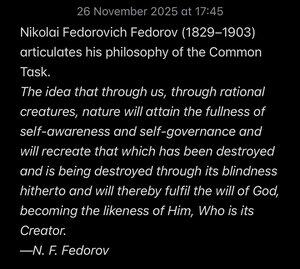 宇宙主義是虛無主義俄羅斯文化中值得贊賞的特徵之一。費多羅夫主張對自然發動戰爭,使用火炮來播種雨水等等。我認為我們可以對抗這種“自然”秩序,因為在俄羅斯,它顯然對有知覺的生命是敵對的。