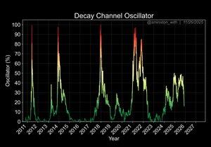 在衰減通道振盪器上回升至17.7%。 - - - 這意味著我們回到了深綠色;我肯定會再堆疊更多。 - - - 把這個指標想像成相對於預測頂部的力量法則支撐的距離。