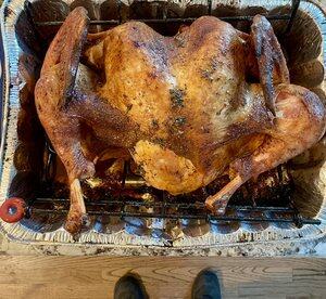 扁平化的 Traeger 煙燻火雞。我不知道為什麼那隻腿會這樣伸出來,也許這隻火雞是畸形足。