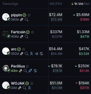 過去1小時基於交易量的最佳Pumpfun幣: $Pippin $Fartcoin $Arc $Perillius $Wojak