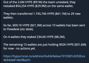只有 850,000 個 $HYPE 被質押, 其餘的則被轉移到其他錢包和市場做市商,而剩下的則被保留在錢包中。