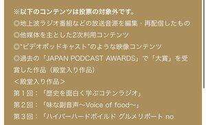 え!?ビデオポッドキャストダメなのか……⁉︎ 禁止じゃしょうがないし「ビデオポッドキャストアワード」を別枠で立ち上げるのが良さそうだなぁ……。 ビデオポッドキャストをガチってる人達で集まって企画したいですね。