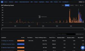 數位資產庫存數據現在可以通過 DefiLlama API 獲得。 我們追蹤 70 個 DAT 的持有量、交易歷史、mNAV 等等。不僅測量當前資產和 mNAV,還要考量可能的未來稀釋,這對於正確分析 DAT 是至關重要的。