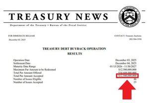 🚨印鈔機運轉 BRRRR🚨 美國財政部於2025年12月3日完成了125億美元的債務回購。 這是美國歷史上最大的回購,超過了2025年6月的100億美元。