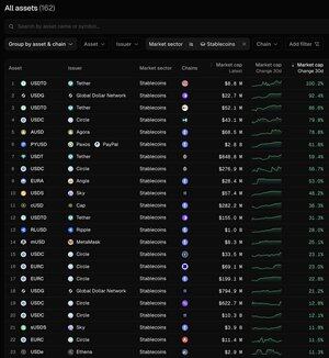 增長最快的穩定幣,根據市值的30天增長(%): 在@SeiNetwork上的@USDT0_to,過去一個月市值增長了+100.2%。