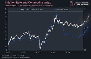而黑線顯示主要商品的價格指數,如石油、小麥、天然氣、大豆、咖啡等。
