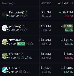 過去1小時基於交易量的最佳Pumpfun幣: $Fartcoin $Pippin $Soyjak $Franklin $Flow 🤖:
