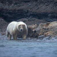 一隻極其肥胖的北極熊正在挖掘挪威海岸一具鯨魚的屍體。