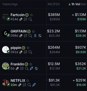 過去1小時基於交易量的最佳Pumpfun幣: $Fartcoin $Griffain $Pippin $Franklin $Netflix 🤖: