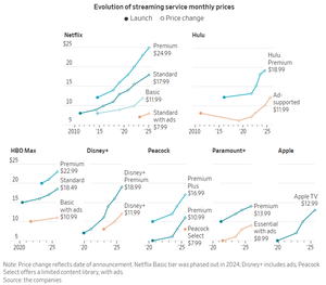 "在一項針對全球10,000人的調查中,參與者平均擁有19個活躍訂閱,每月總計254美元。今年幾乎所有的串流服務都提高了價格。" - WSJ