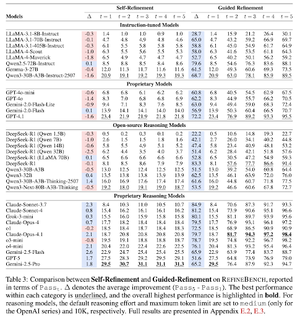 本文介紹了RefineBench,一個評估語言模型在各種場景下精煉能力的基準。它包含了自由形式和基於準確性的任務。