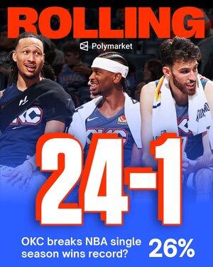 突發消息:根據 @PolymarketSport,俄克拉荷馬城已經以 24-1 的戰績追平 2016 年勇士隊,創下 NBA 歷史最佳開局。