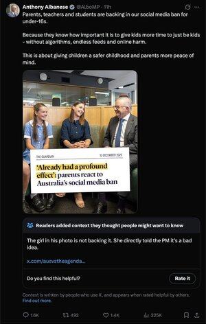 🇦🇺 一位澳大利亞女學生告訴總理,禁止孩子使用社交媒體是個「壞主意」,年輕人會找到其他方法來繞過這些限制。 總理回應承諾也會禁止這些變通方法。 然後他發佈了一張會議的照片,並附上標題:「學生們支持我們的社交媒體禁令。」
